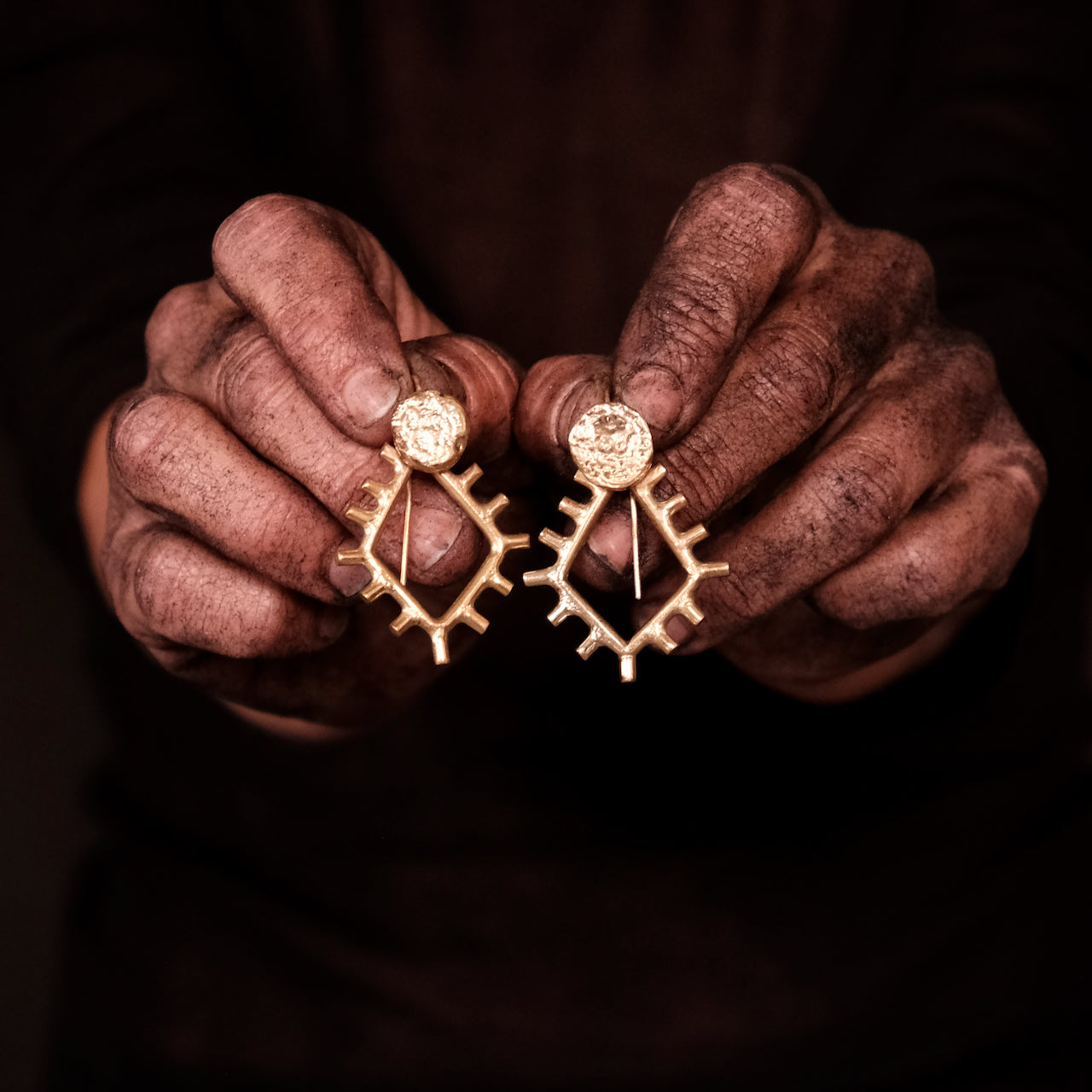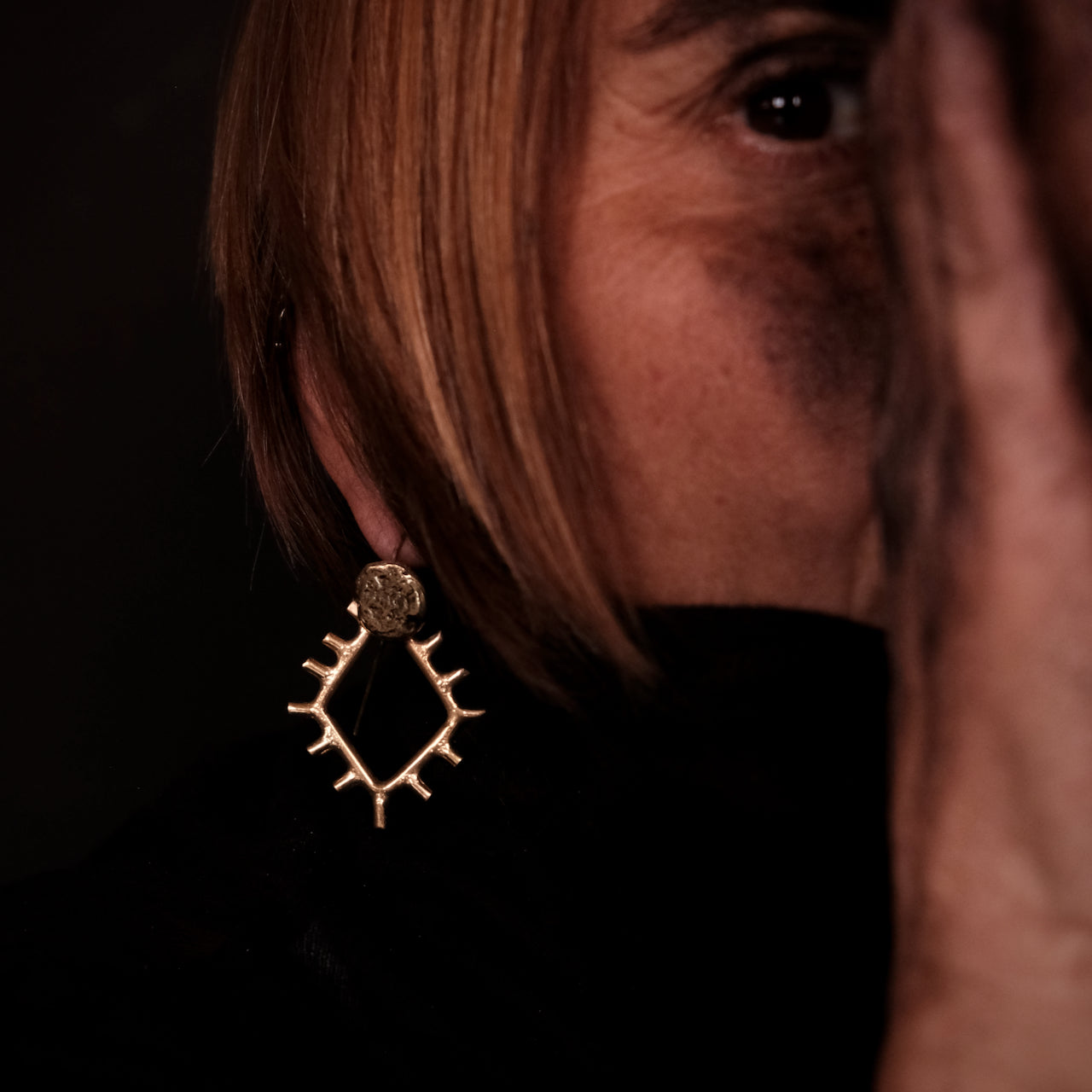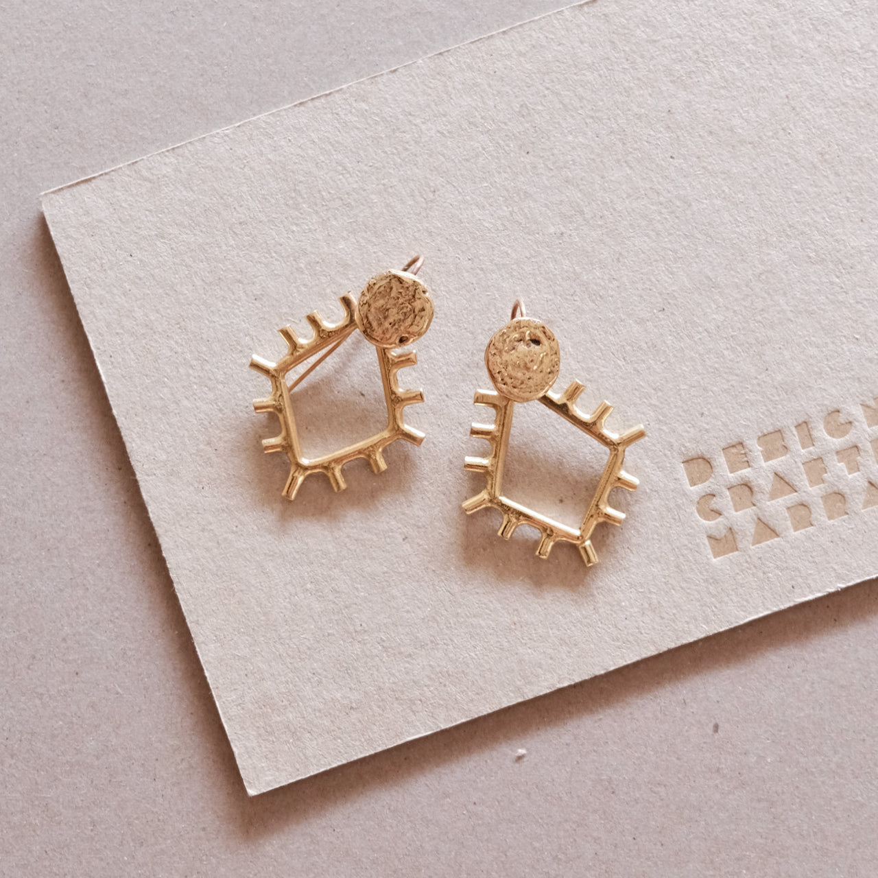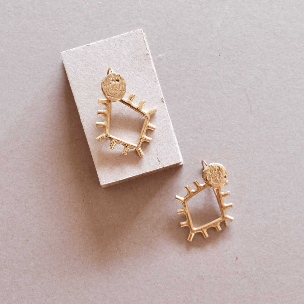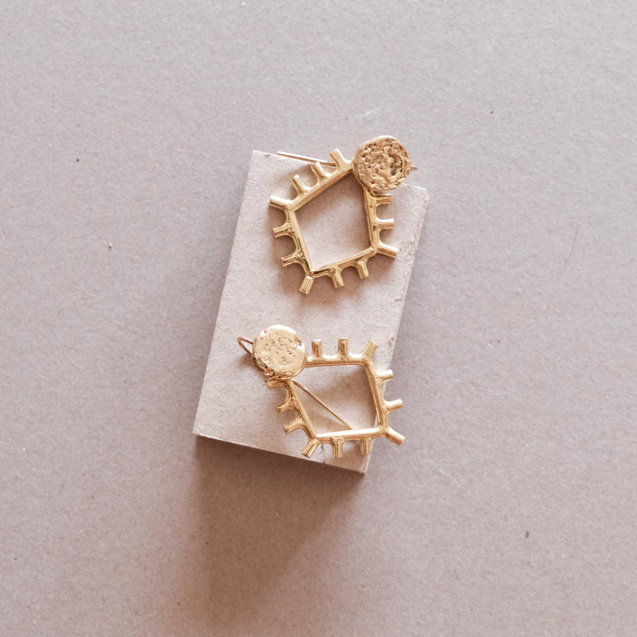 Pendientes en forma de ojo con un disco de latón fundido en la parte superior conectado al gancho para la oreja.