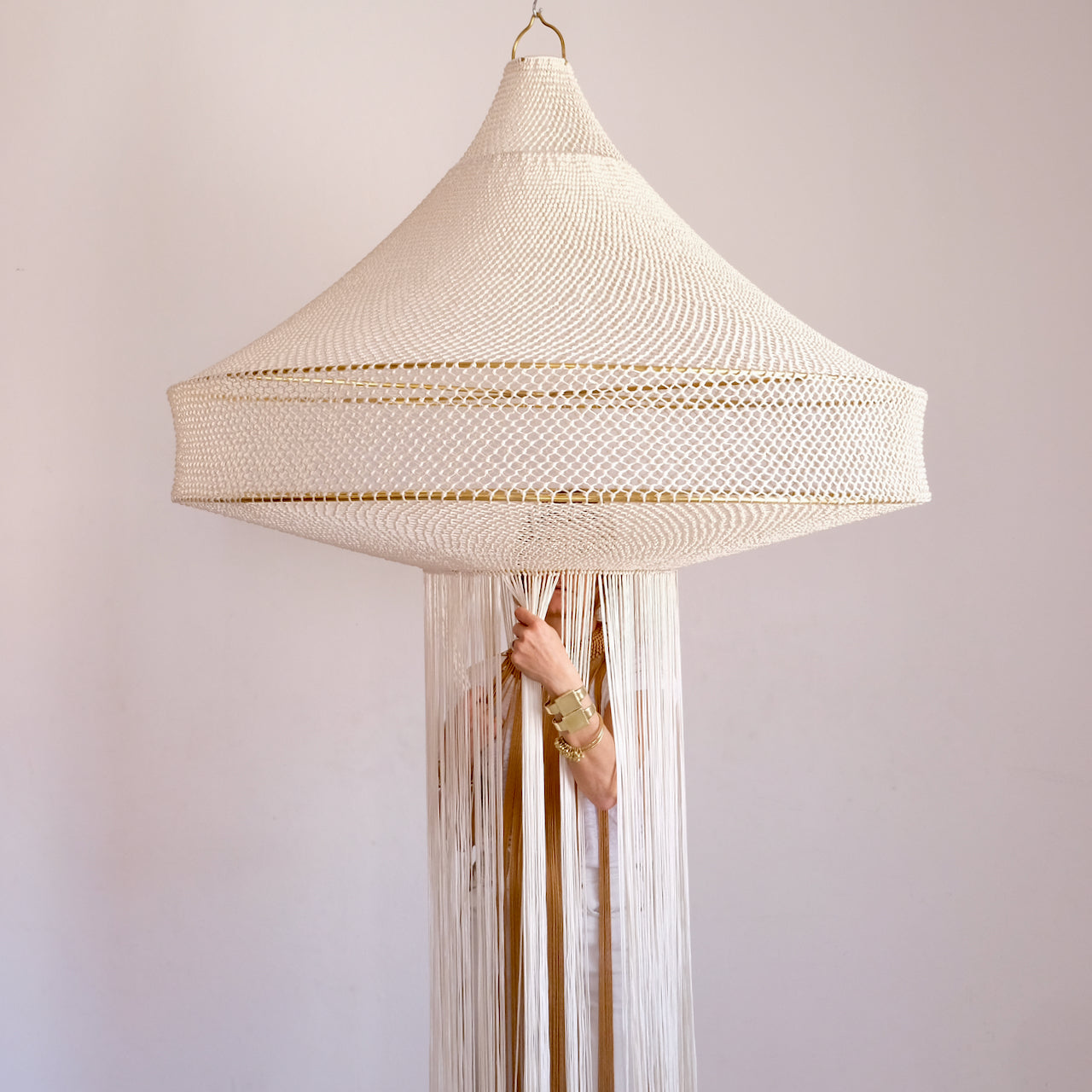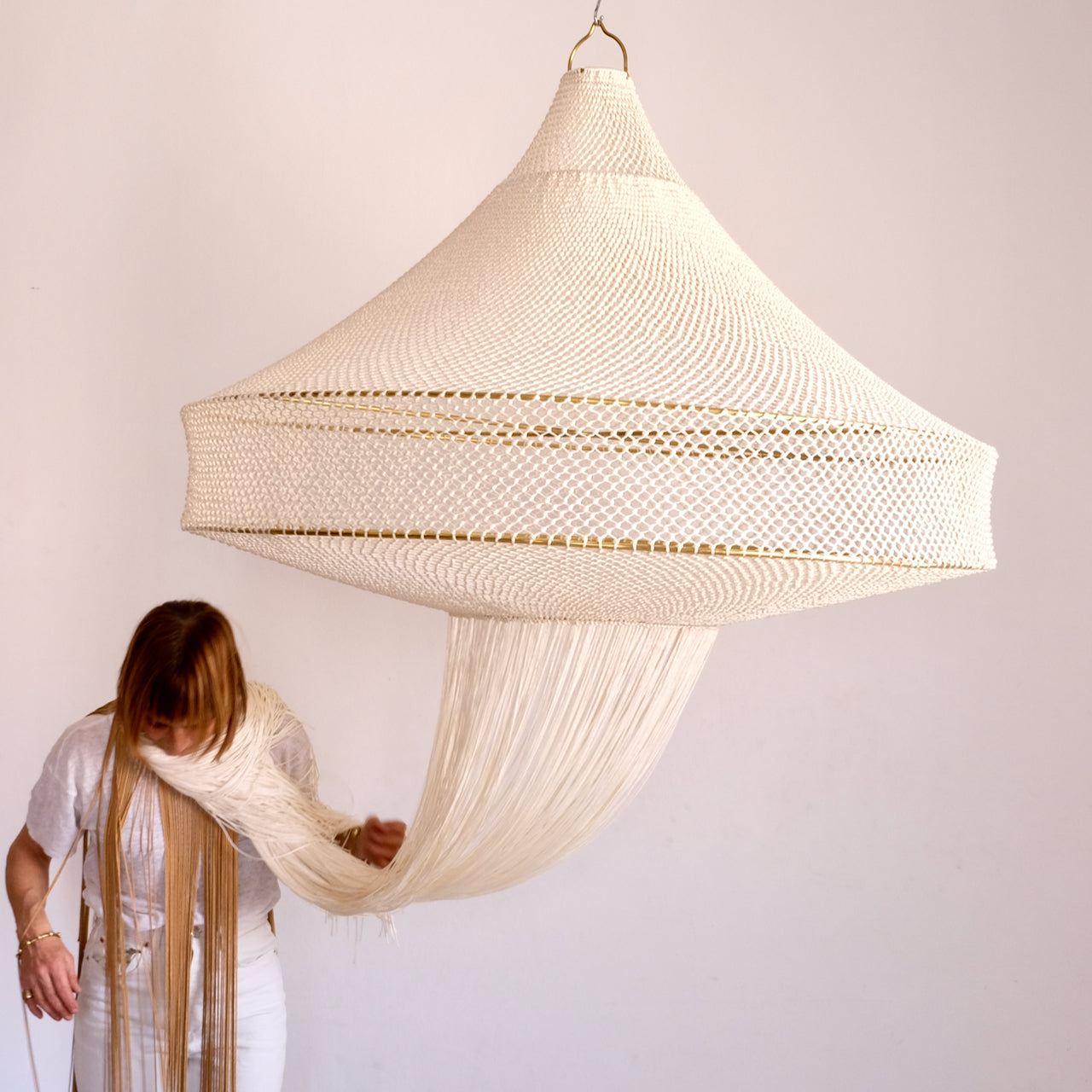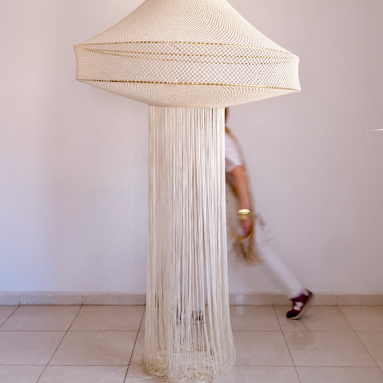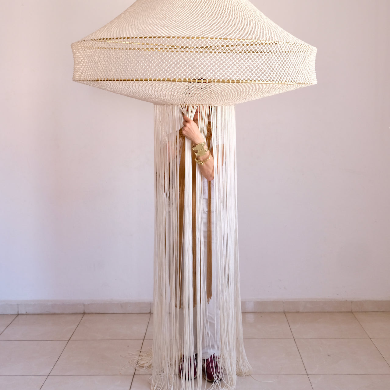 Indulge in the opulence of our meticulously handcrafted Loubna macrame lamp. Every intricate detail has been carefully attended to, resulting in a truly luxurious piece. The elegant contrast of beige and brass exudes refined style, while playful fringing adds a touch of whimsy. With its hand-knotted design, this lamp showcases exceptional artistry and demands attention in any setting. A masterpiece that cannot go unnoticed, this lamp will take center stage in any decor. Handcrafted in Marrakech, it is a true work of art.