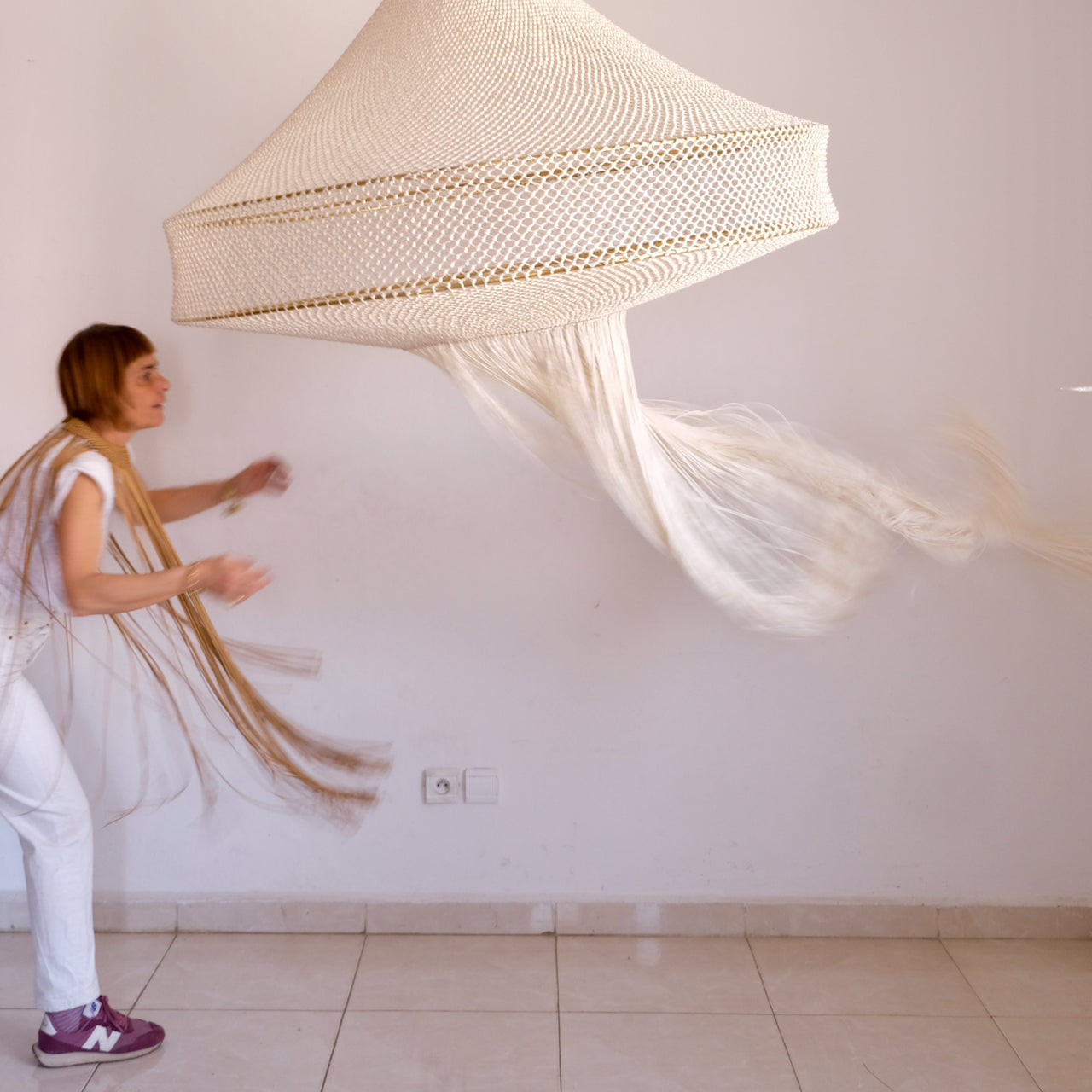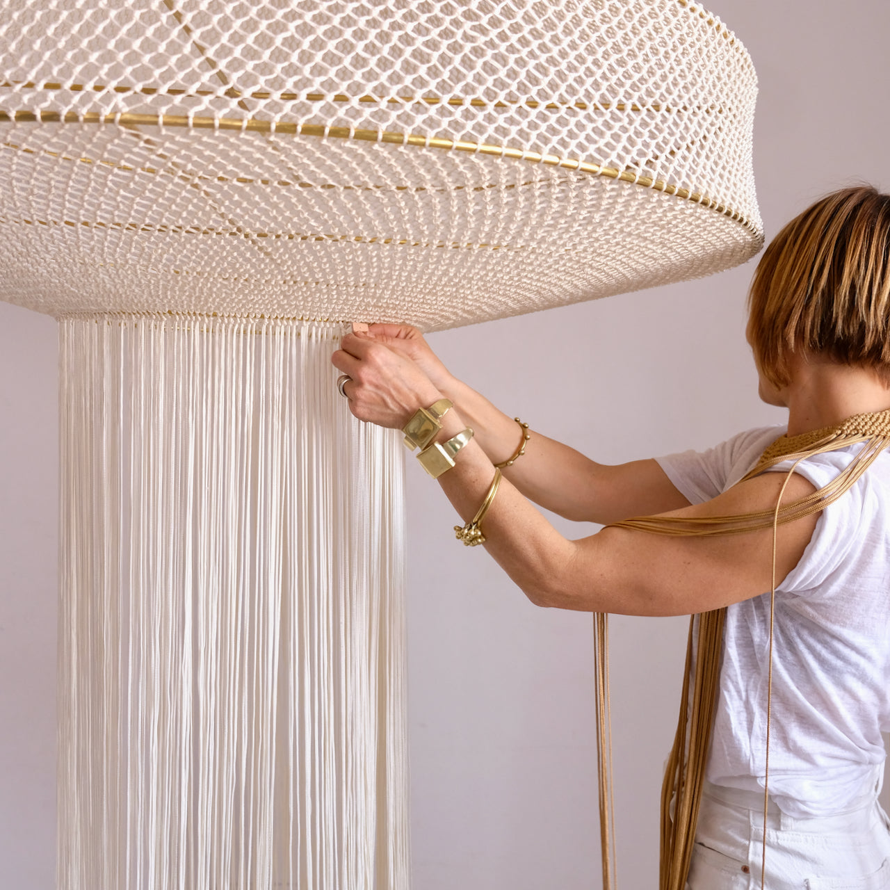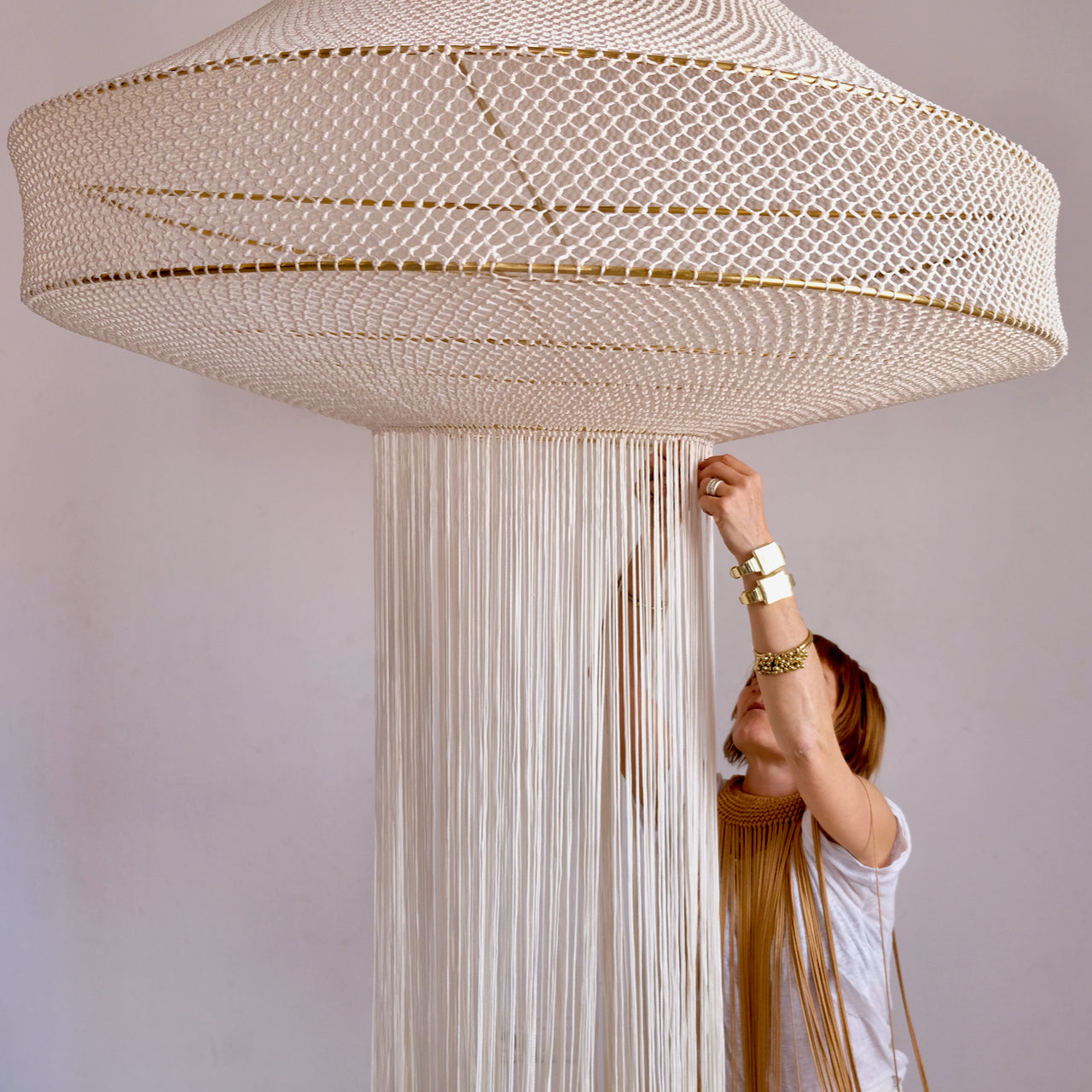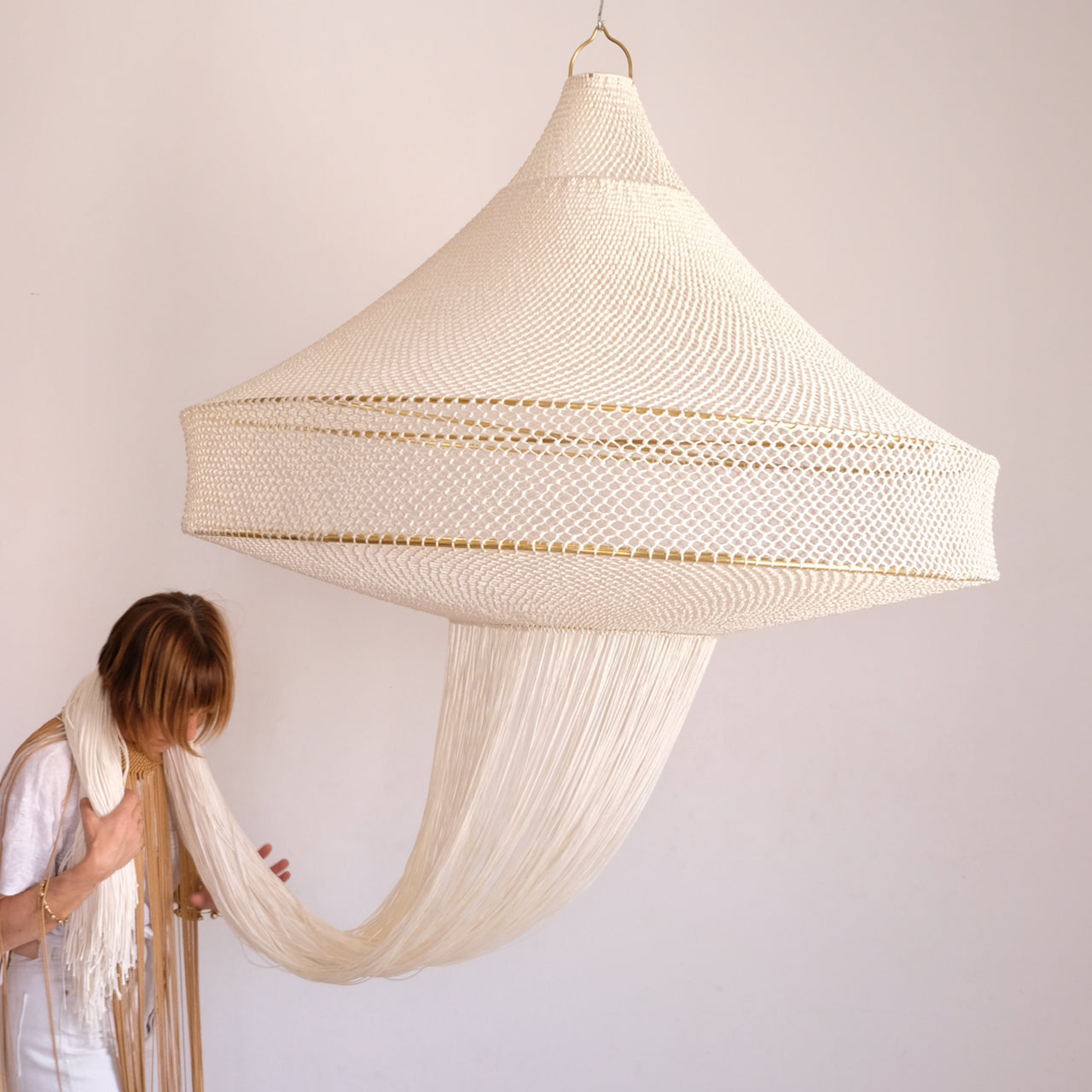 Indulge in the opulence of our meticulously handcrafted Loubna macrame lamp. Every intricate detail has been carefully attended to, resulting in a truly luxurious piece. The elegant contrast of beige and brass exudes refined style, while playful fringing adds a touch of whimsy. With its hand-knotted design, this lamp showcases exceptional artistry and demands attention in any setting. A masterpiece that cannot go unnoticed, this lamp will take center stage in any decor. Handcrafted in Marrakech, it is a true work of art.