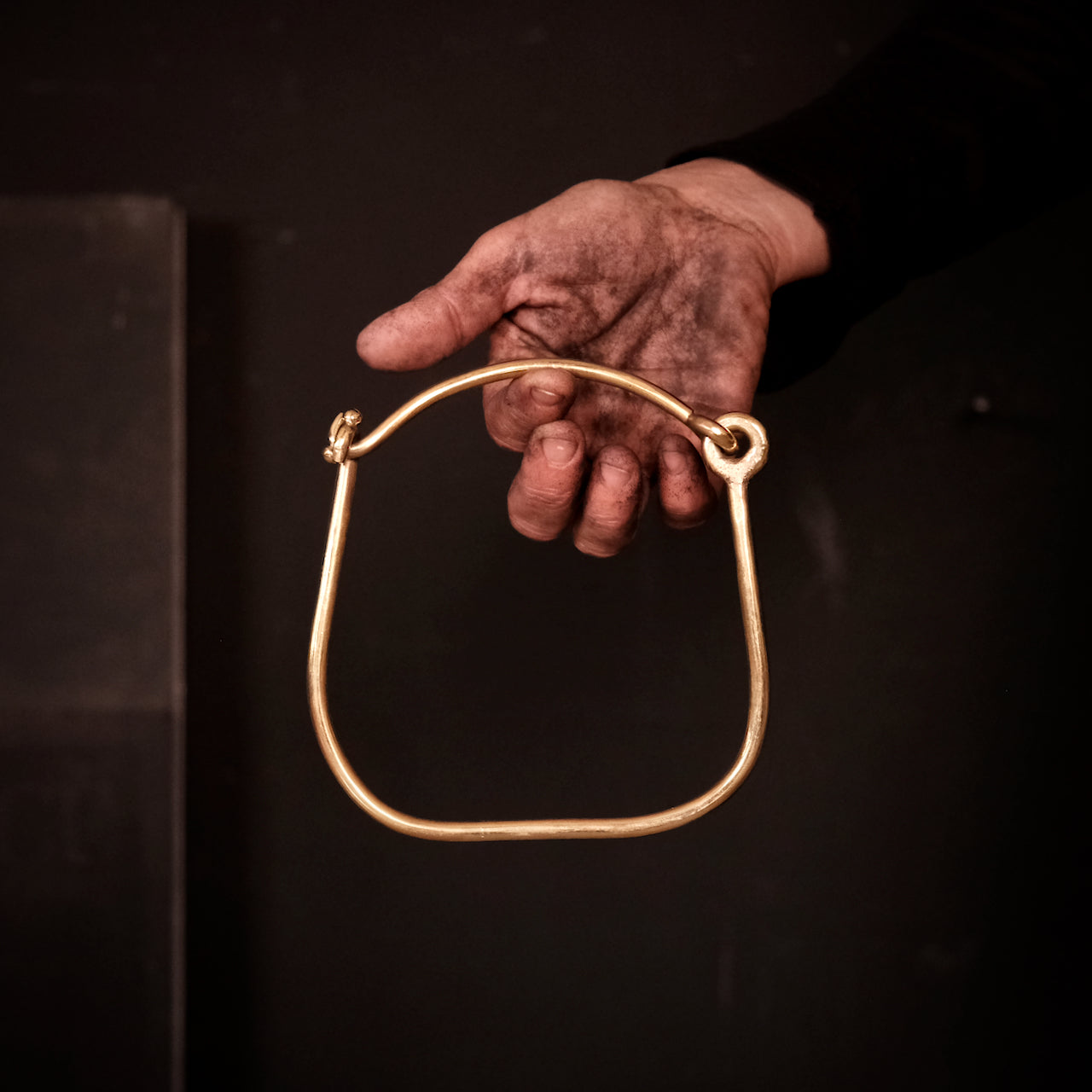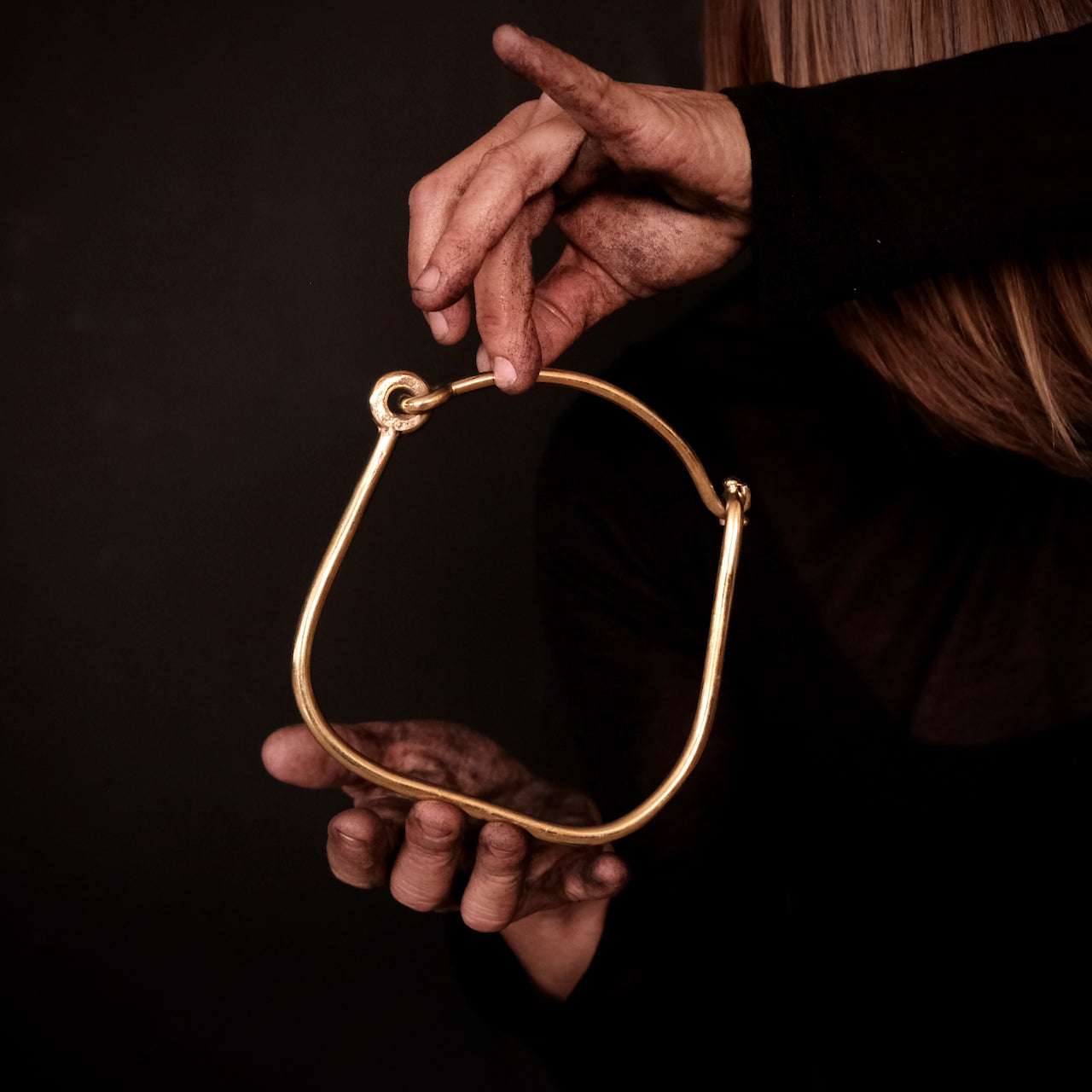 Tour de cou en laiton massif fait à la main avec une forme rectangulaire douce et un style de bride audacieux. Son design minimaliste se démarque.