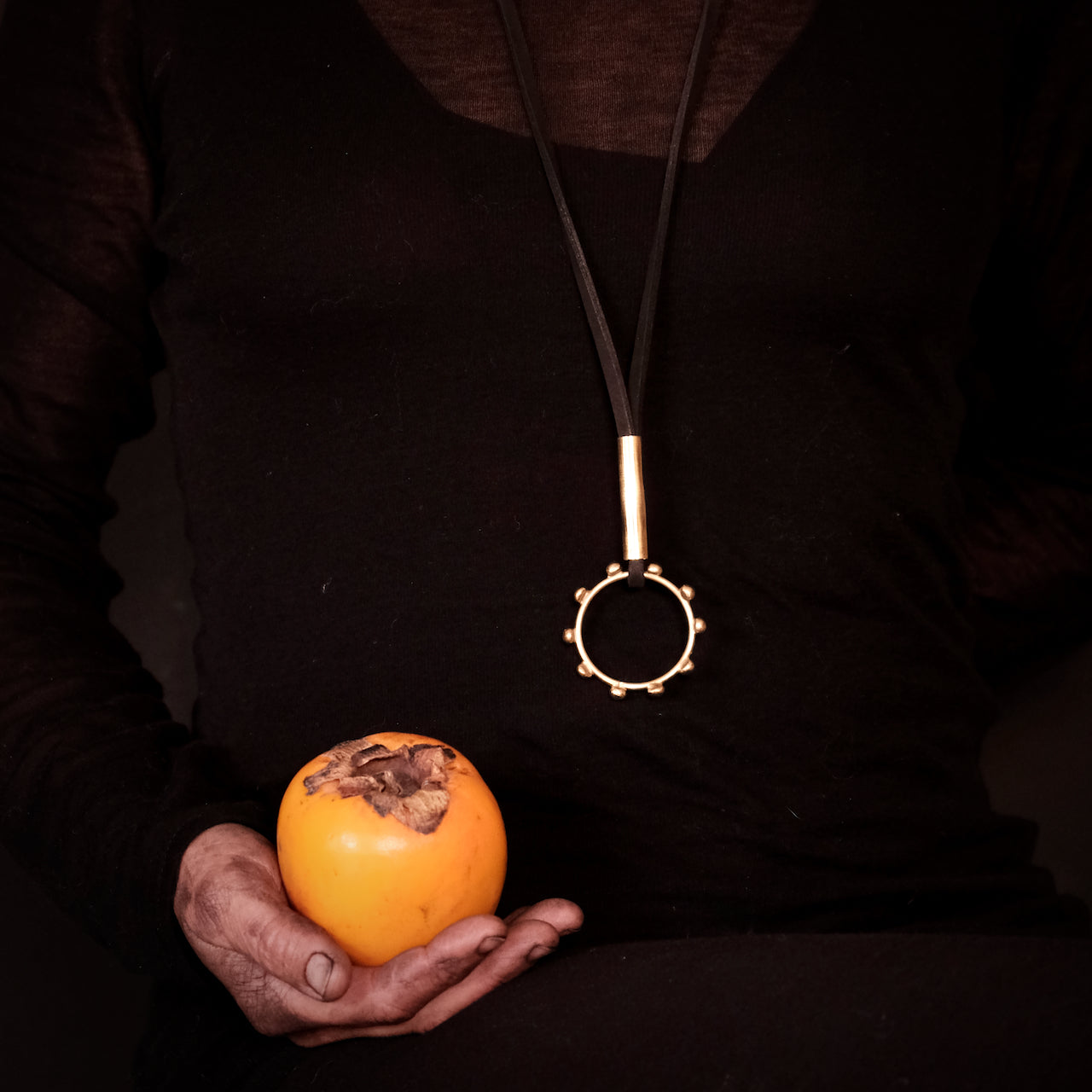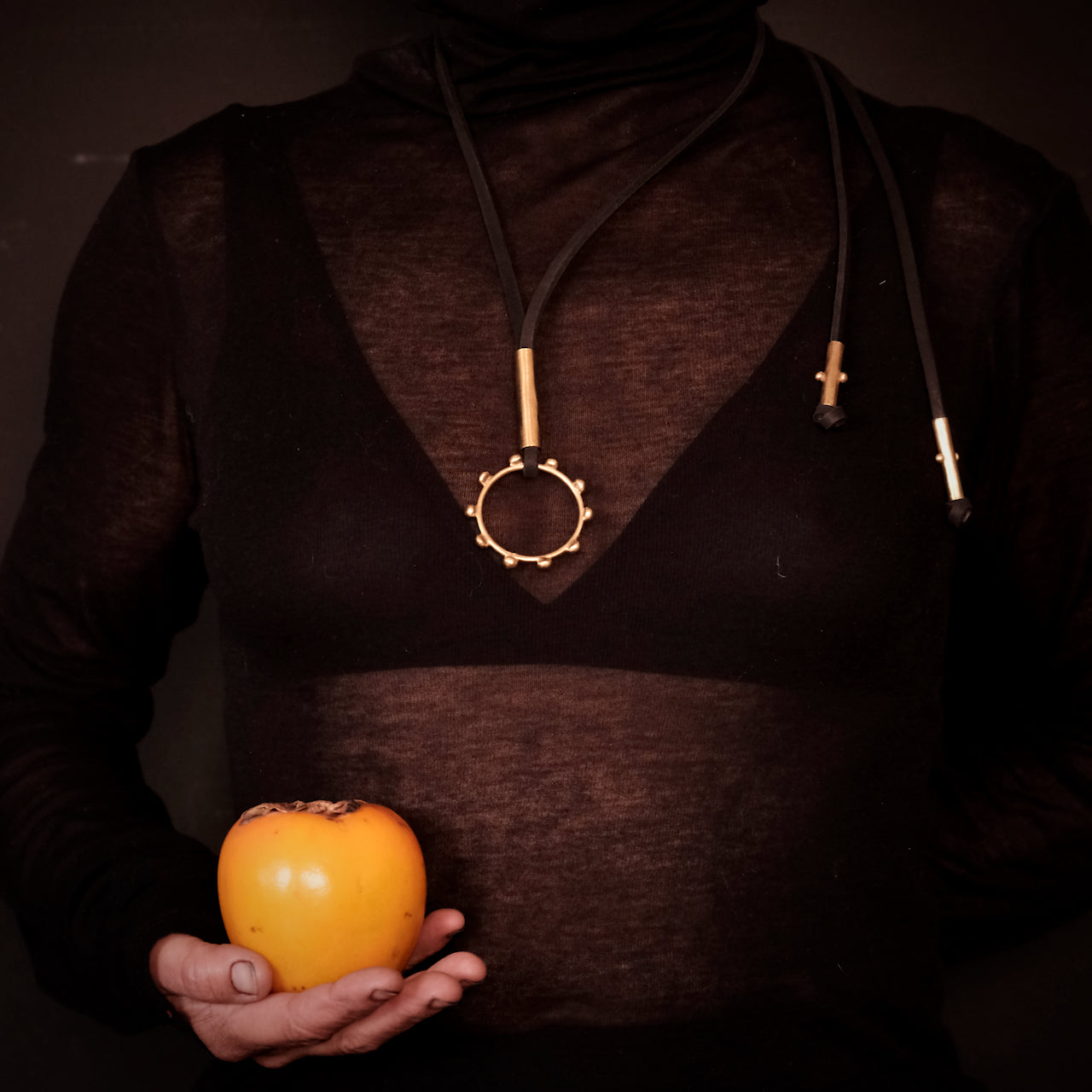 - Disponible avec tour de cou réglable en cuir cognac, noir ou sable.