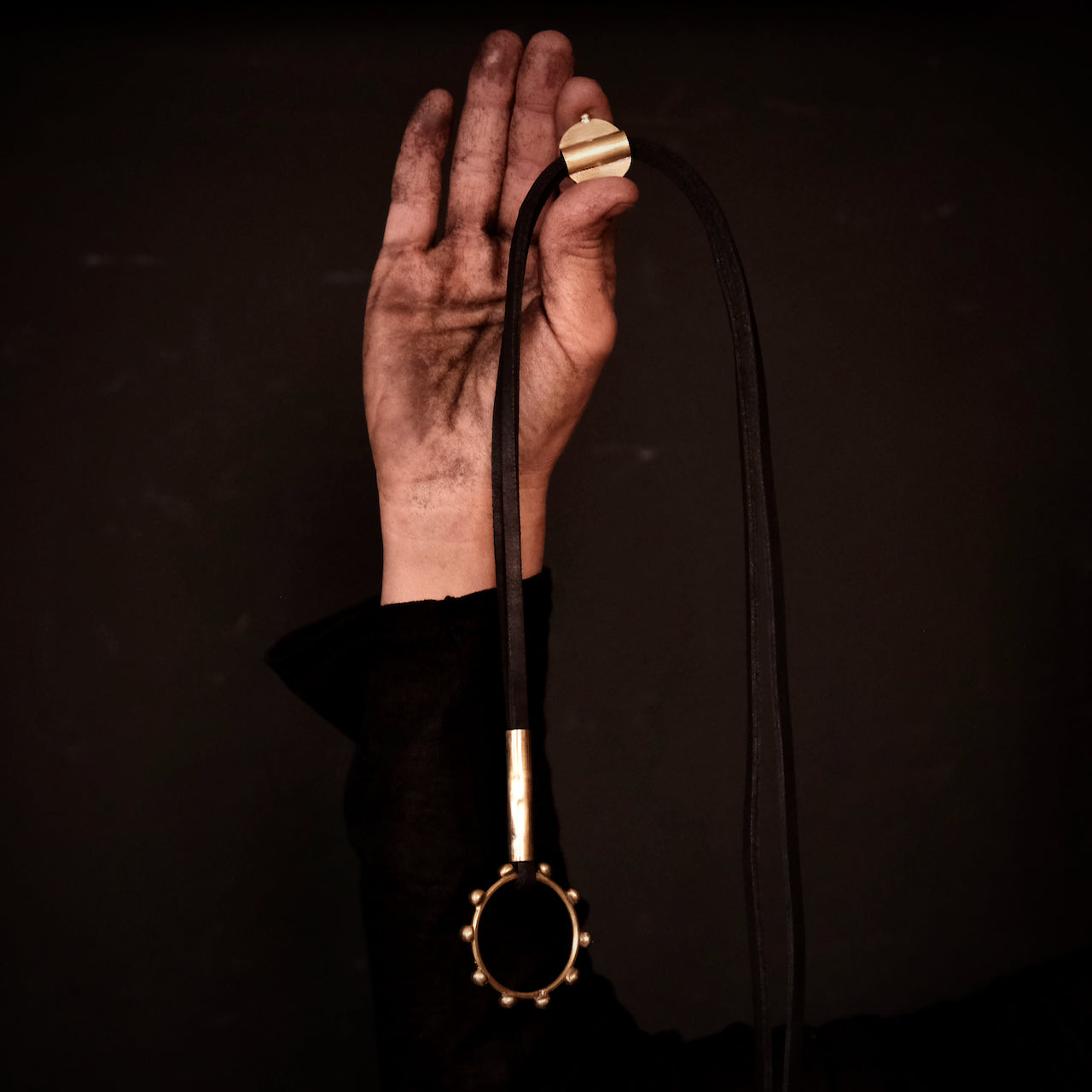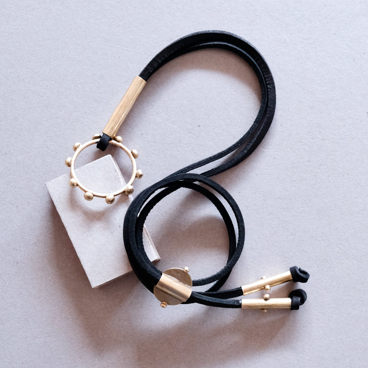 Cercle orné de points sur une bande de cuir réglable avec détails cylindriques en laiton.