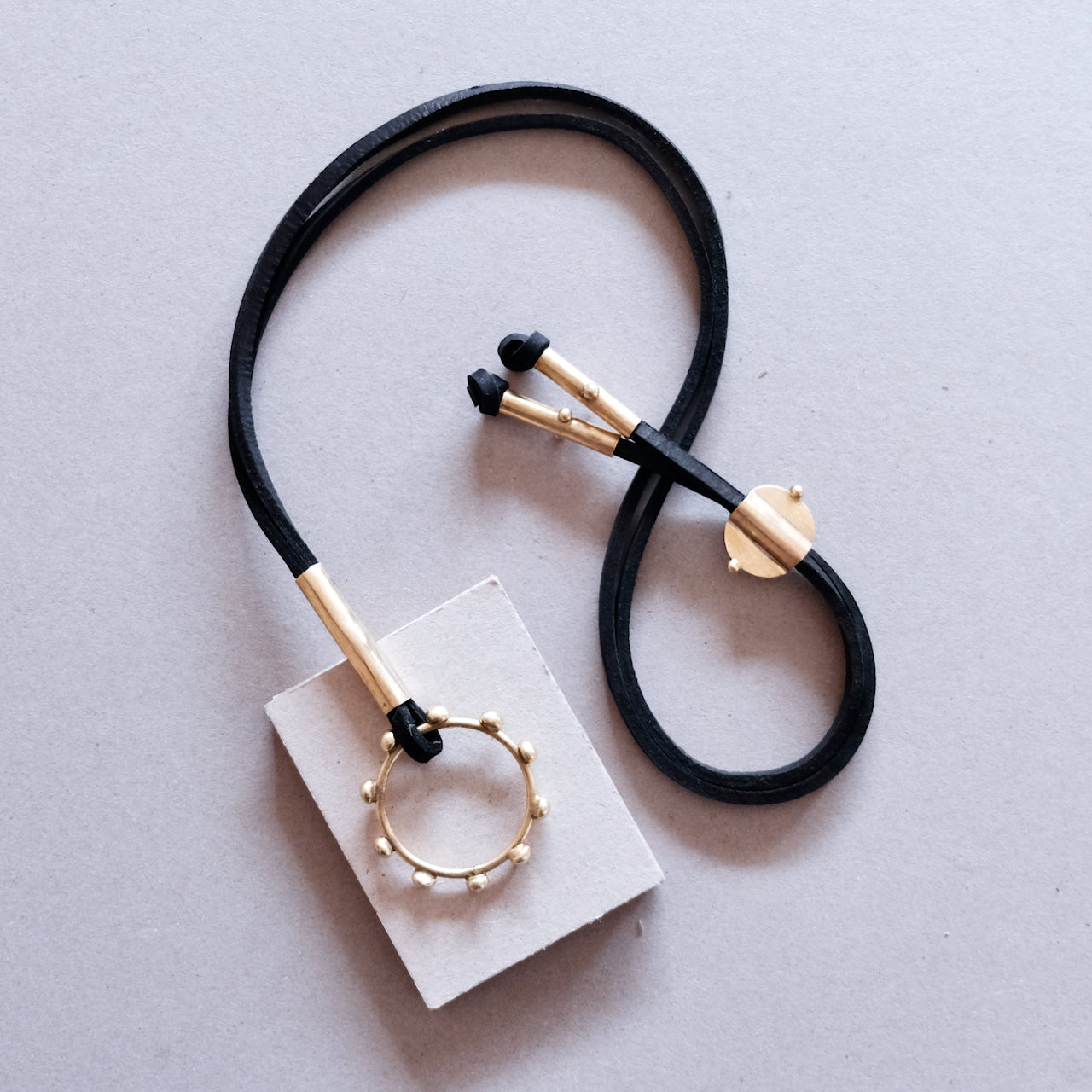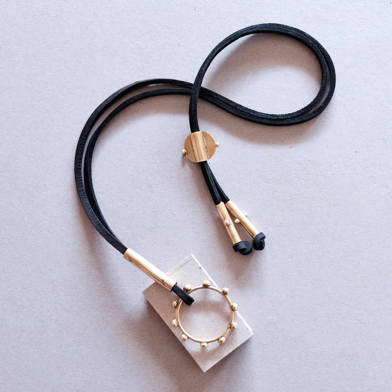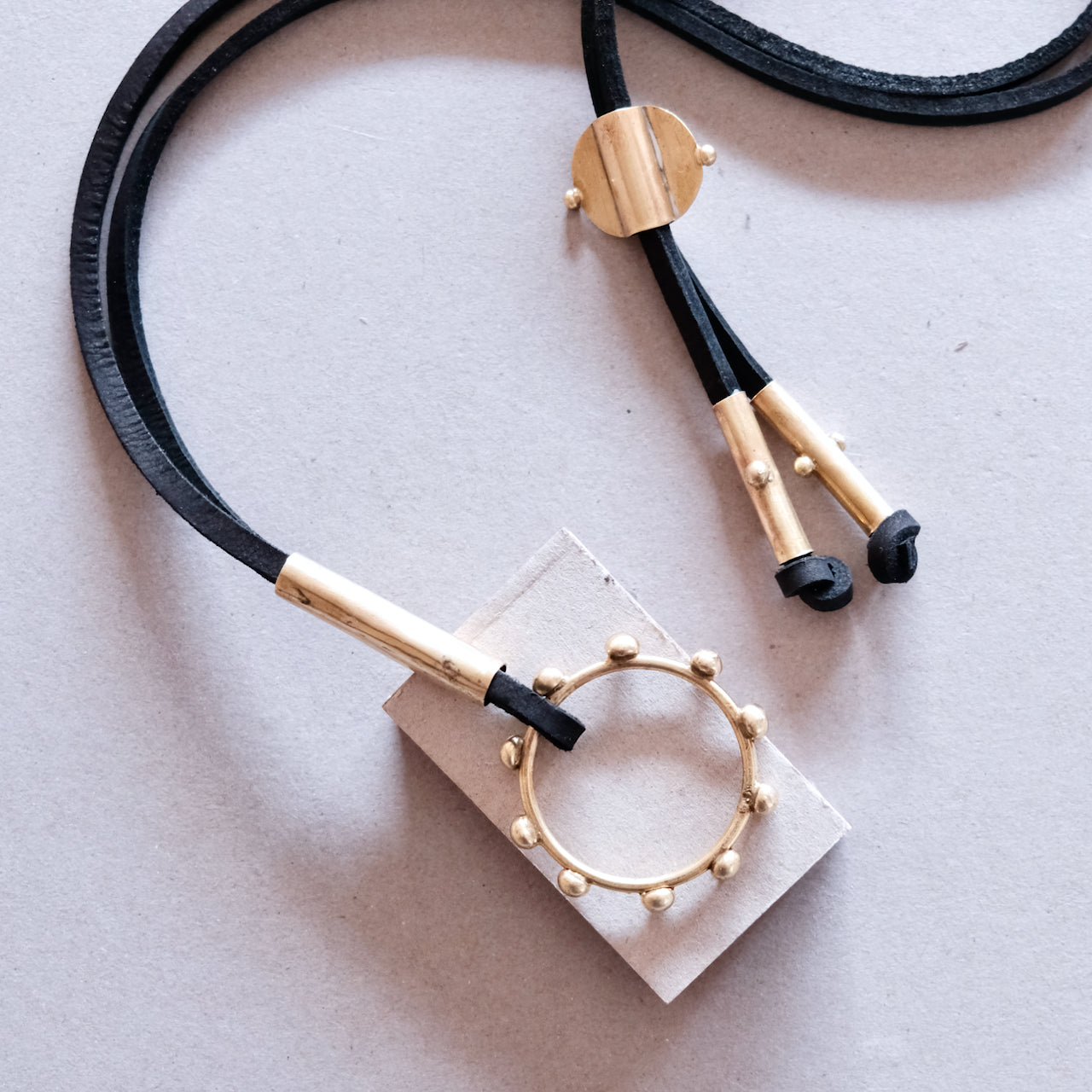 Collection de bijoux contemporains d'inspiration berbère distinctive définie par les points en relief qui figurent sur chaque pièce. Chaque pièce est fabriquée à la main de manière artisanale traditionnelle à partir de laiton recyclé et les colliers sont dotés de tour de cou en cuir souple de première qualité de couleur cognac, noir ou sable.