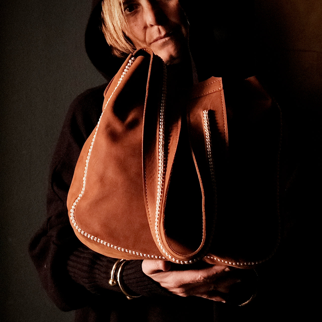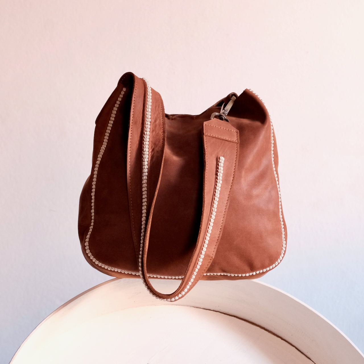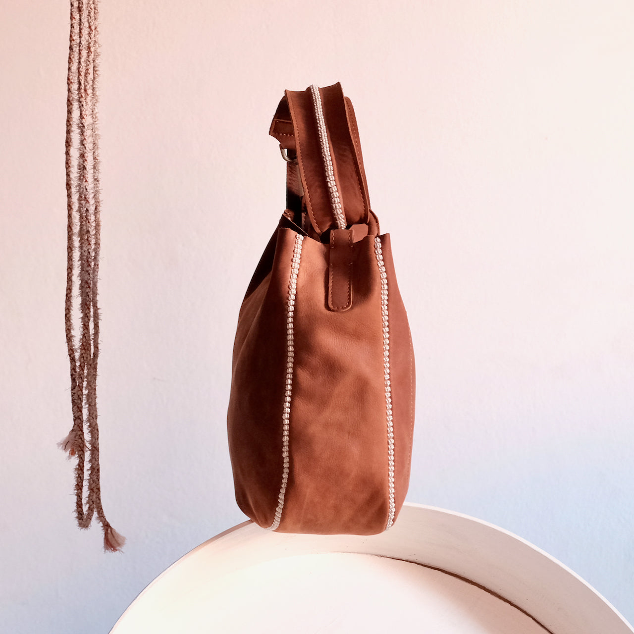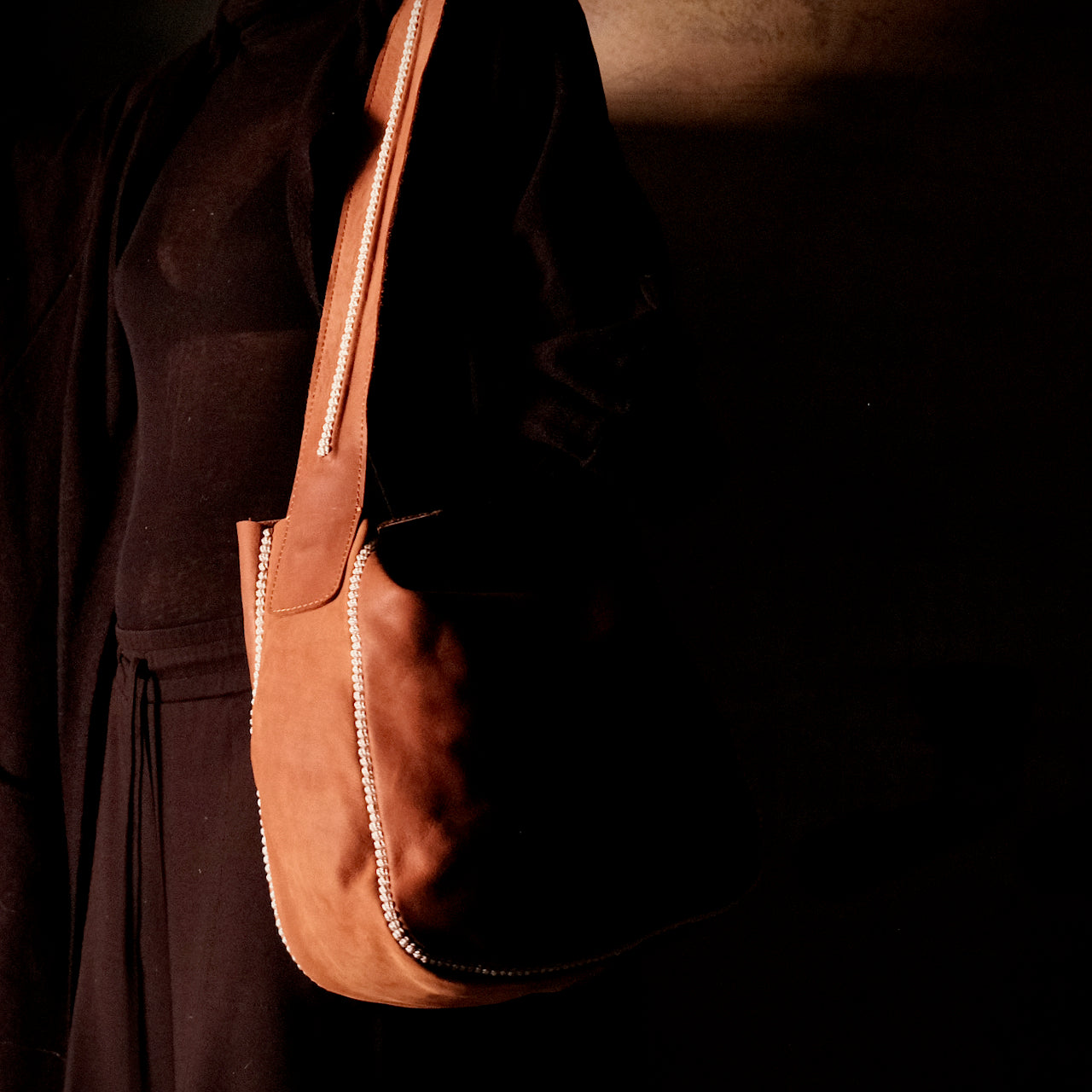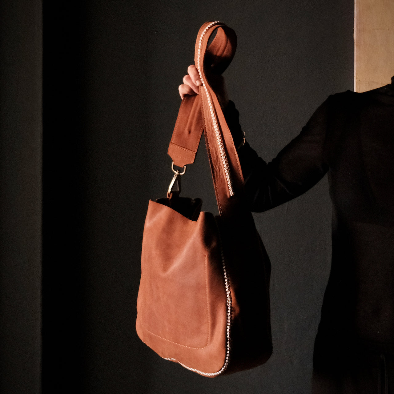 Détail contrasté 'Sarma' cousu main sur le sac et la bandoulière