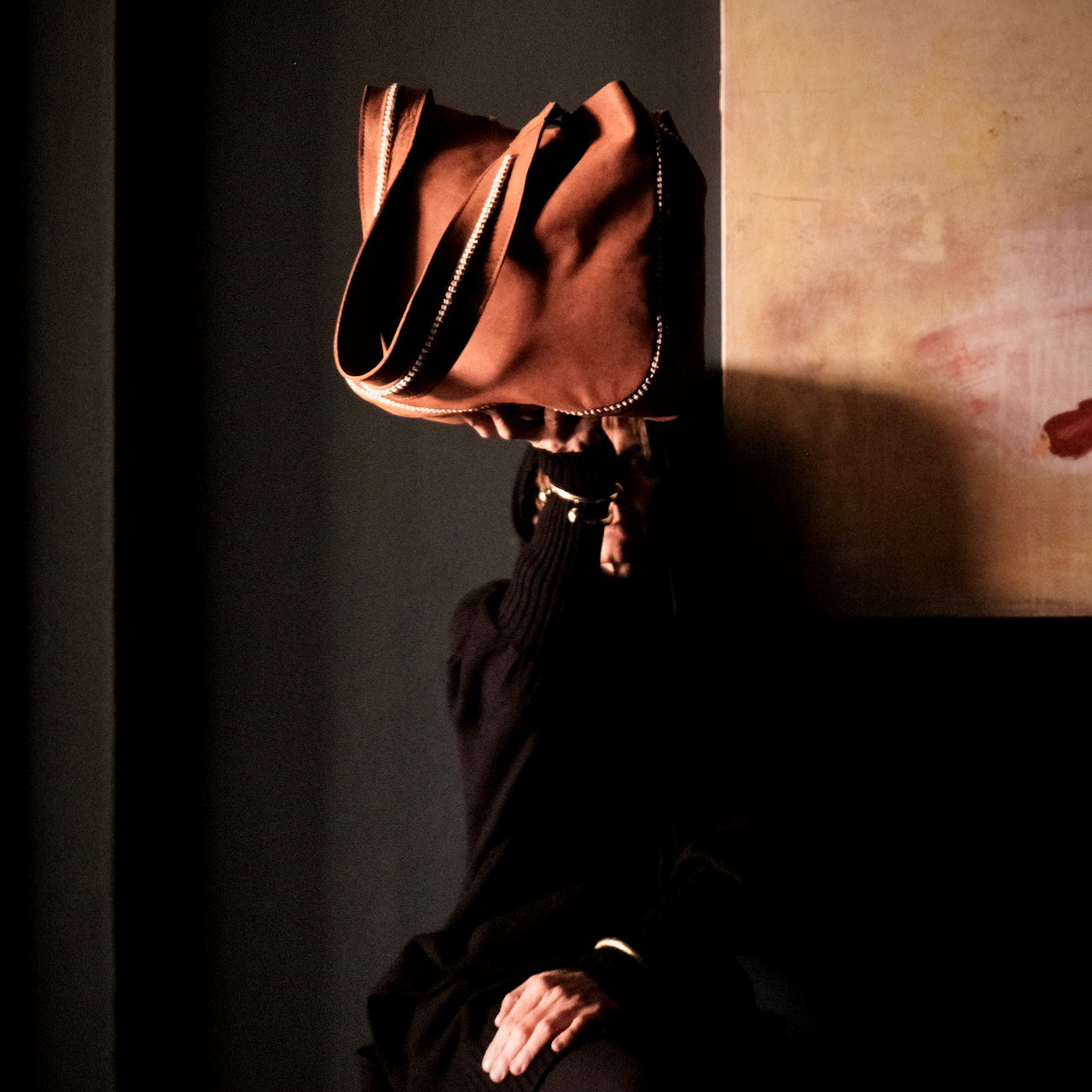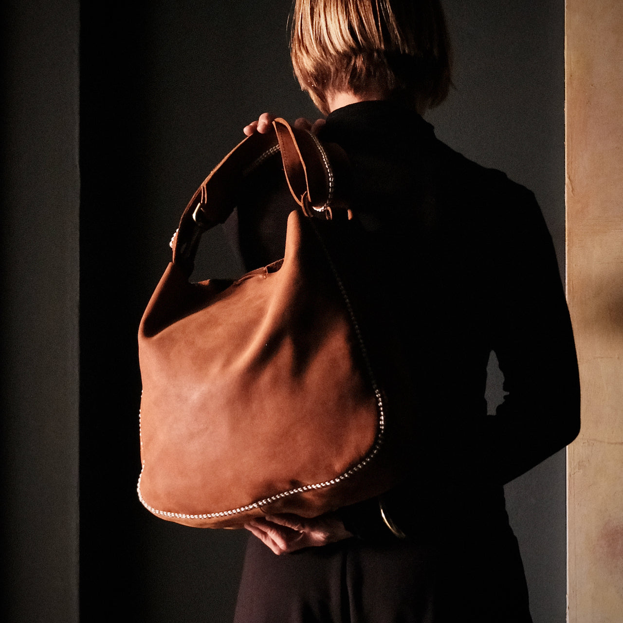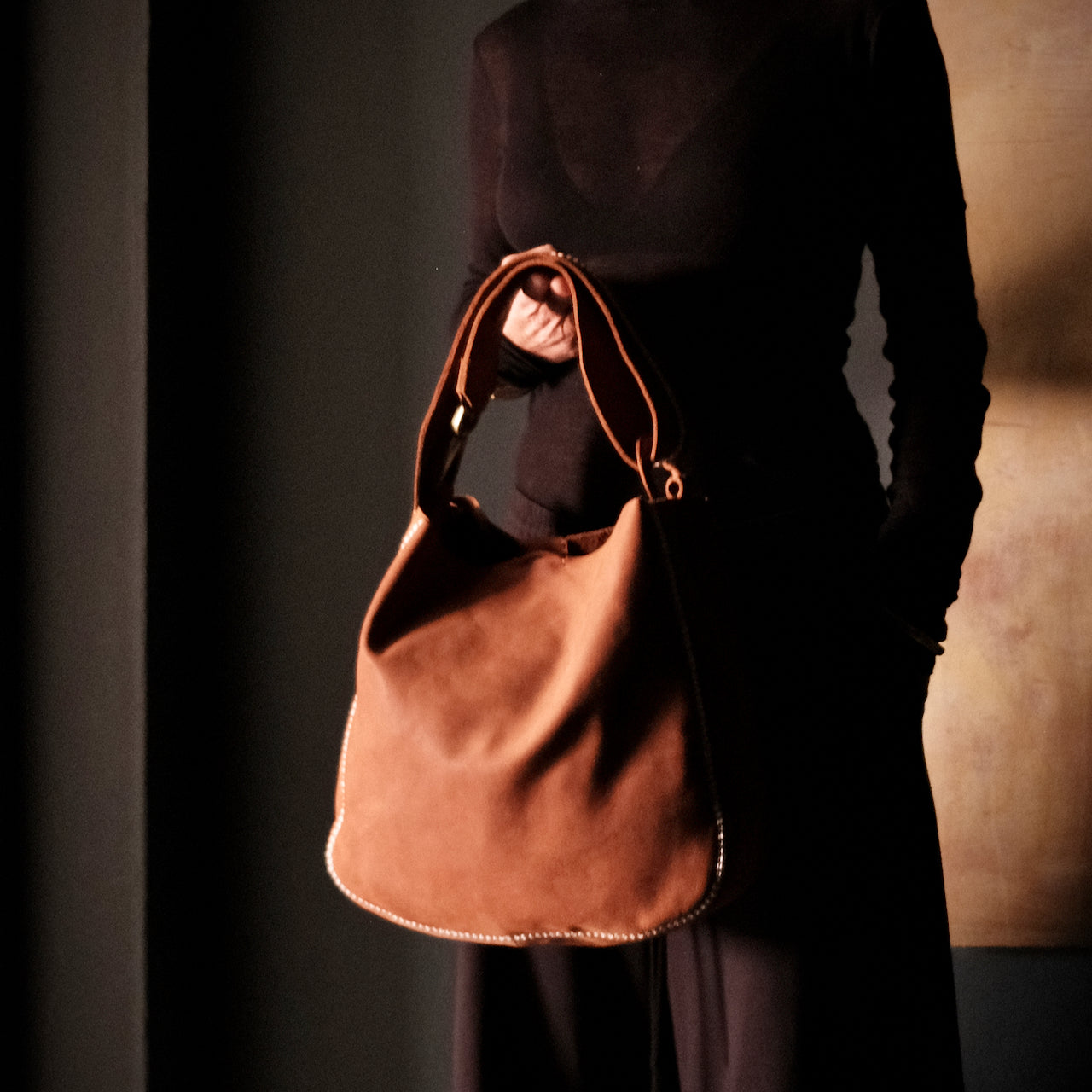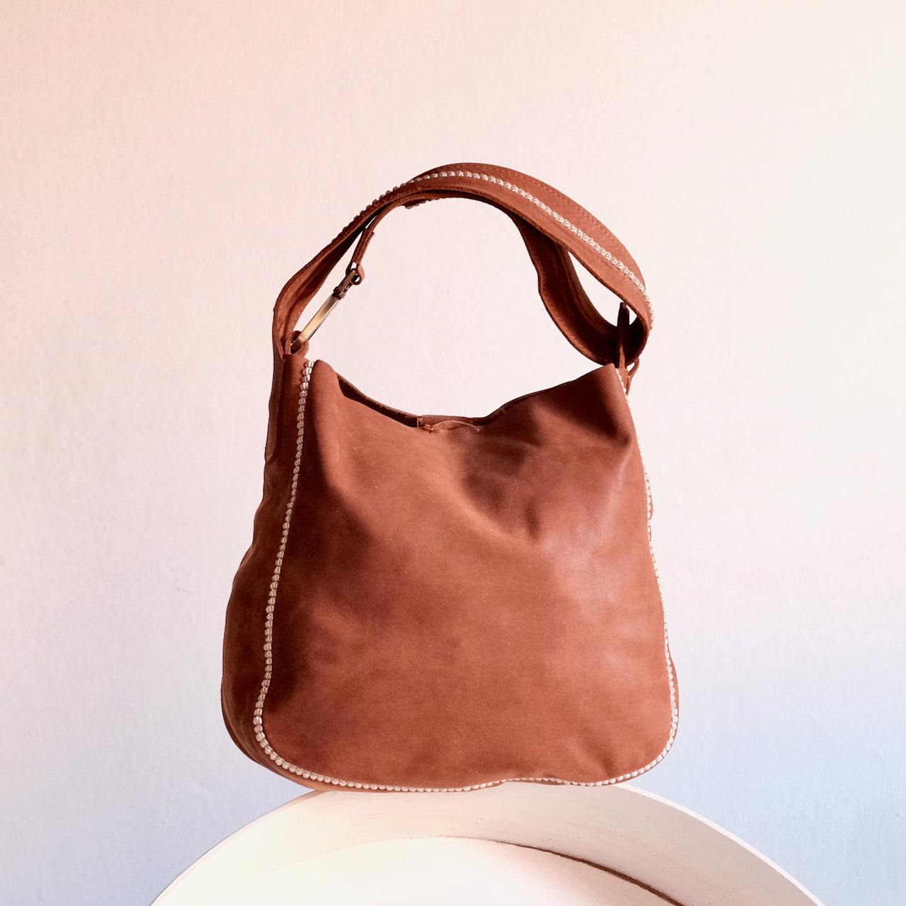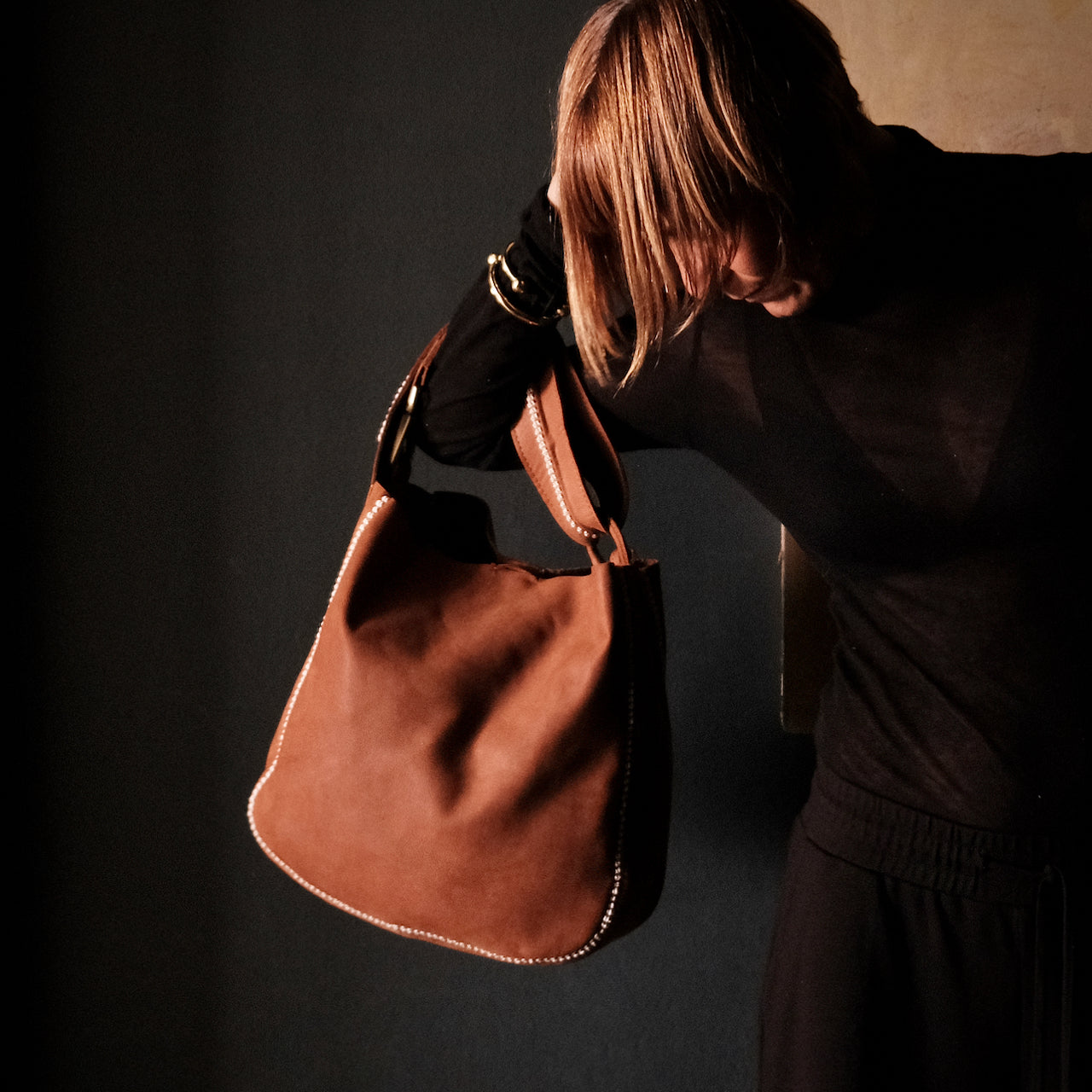 Détail contrasté 'Sarma' cousu main sur le sac et la bandoulière